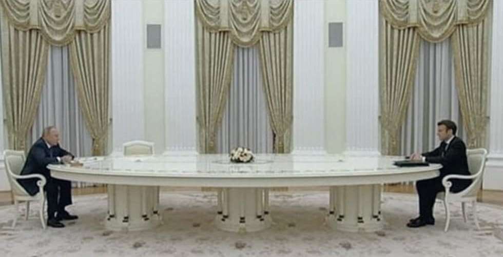 پوتین و مکرون هنگام ملاقات با یکدیگر دست ندادند. سران کشورها در فاصله چشمگیری از یکدیگر – در انتهای مخالف میز بیضی شکل جای گرفتند. همین گزینه ارتباطی هفته گذشته در جریان گفتگوهای رئیس جمهور روسیه و نخست وزیر مجارستان انتخاب شد.
